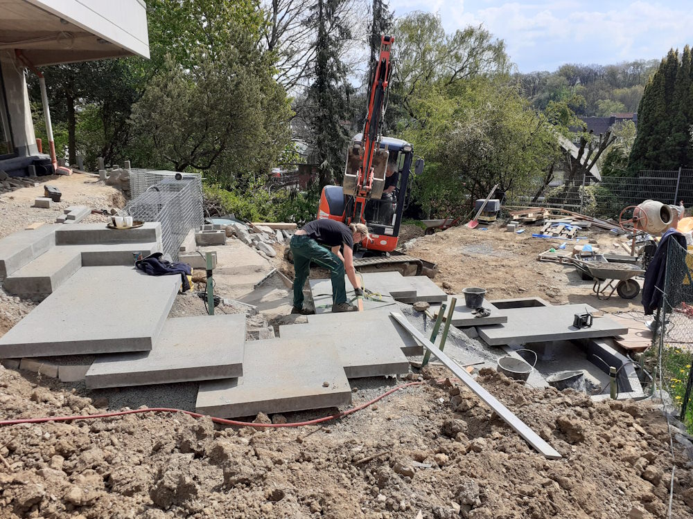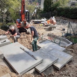 Die Terrassierung für Beete wurde mit Basalt Wasserbausteinen gelöst.