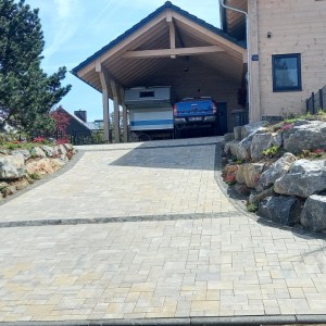 Passend zum Farbenspiel der Steine wurden die Betonpflaster als "Muschelkalk nuanciert" gewählt und im Römischen Verband verlegt. 1 - 3 Reihen Basalt Kleinpflaster säumen den Eingangsbereich.