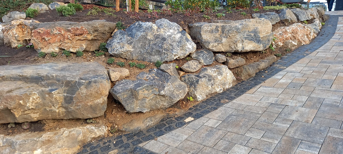 Die ca. 18 % steile Auffahrt wurde zu beiden Seiten mit bis zu 1,8 t schweren Kalkstein Findlingen begrenzt. Die Fugen zwischen den Steinen wurden mit den entsprechenden Stauden und Gräsern bepflanzt.