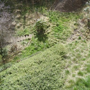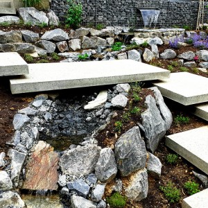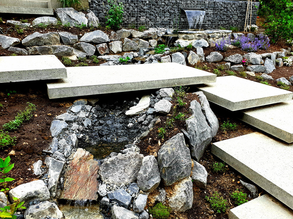 Ein kleiner Edelstahlwasserfall entspringt aus einer Gabione. Der kleine Bachlauf mündet in ein Becken im Rasen und kreuzt dabei die Schwebestufen.
