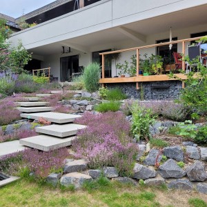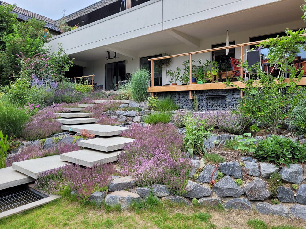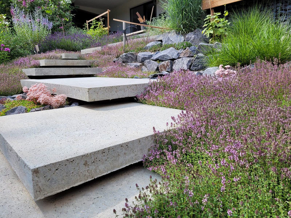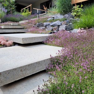 Thymian und weitere insektenfreundliche Pflanzen begleiten die Schwebestufen zu beiden Seiten.