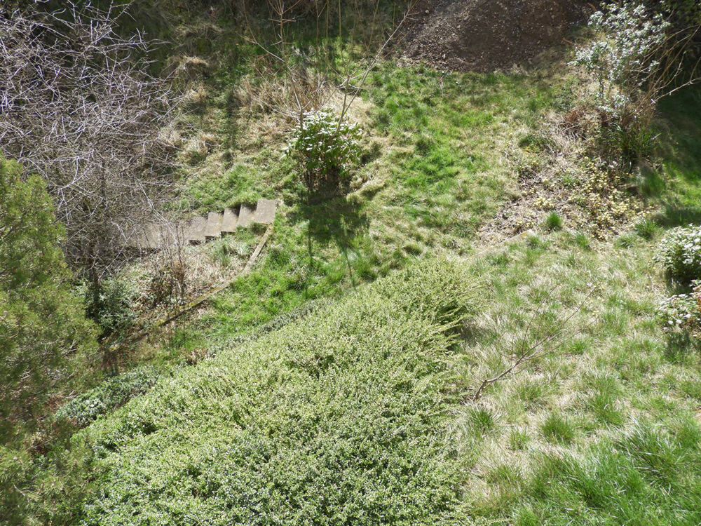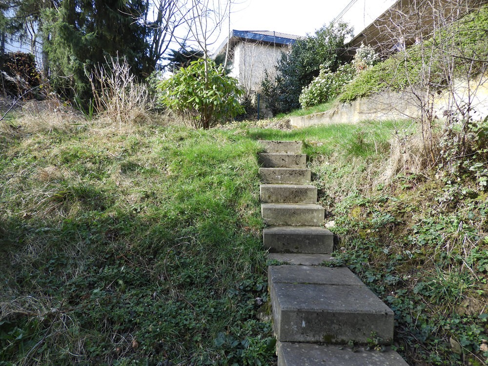Der immense Höhenunterschied des Grundstücks wurde für die Holzterrasse mit Gabionen abgefangen, die hier die Funktion einer Stützmauer haben.
