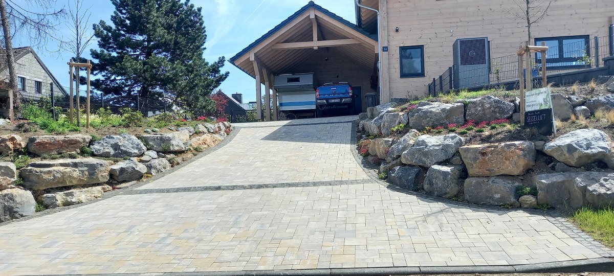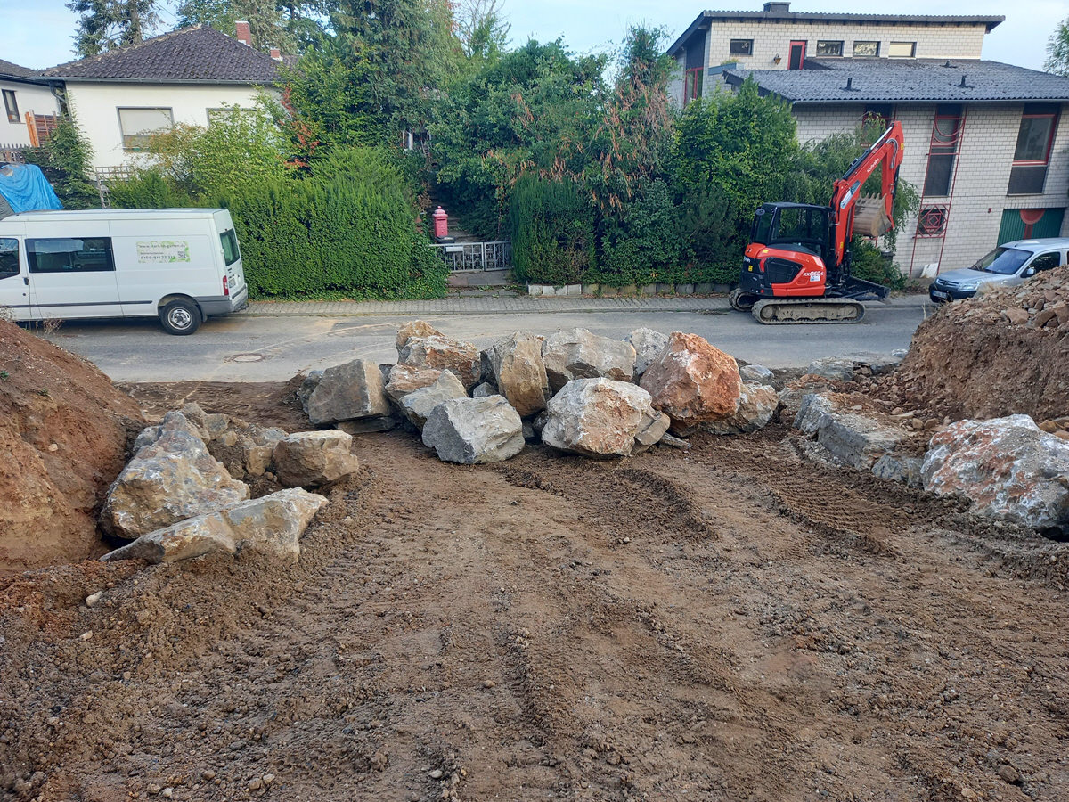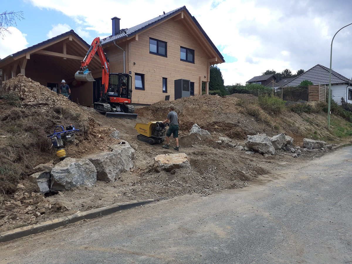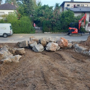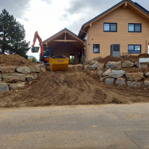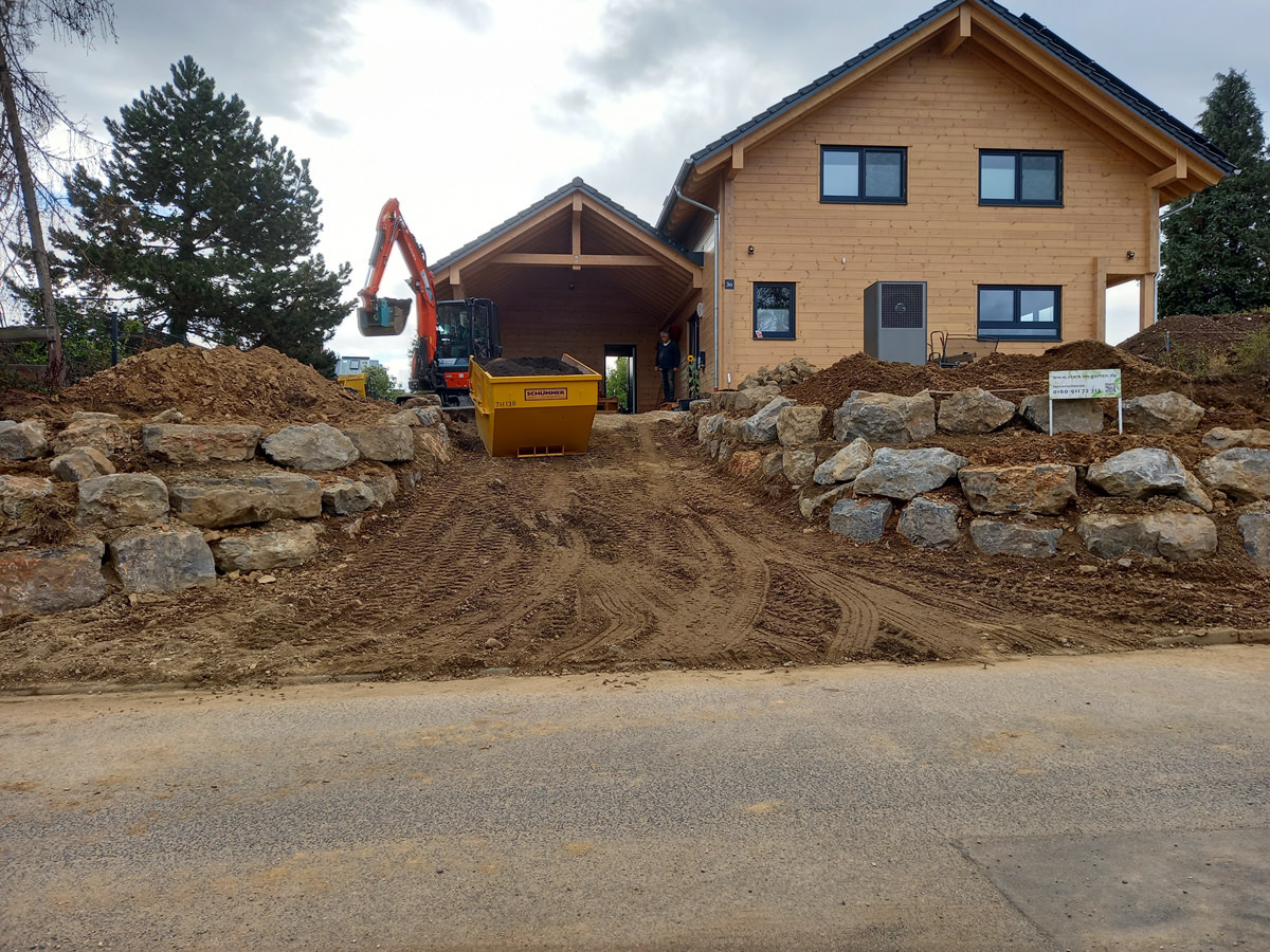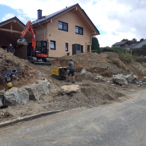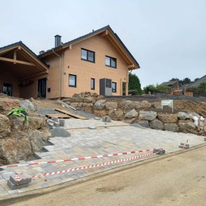 Herstellung einer Auffahrt mit Setzung einer Natursteinmauer
