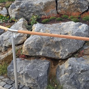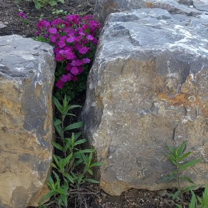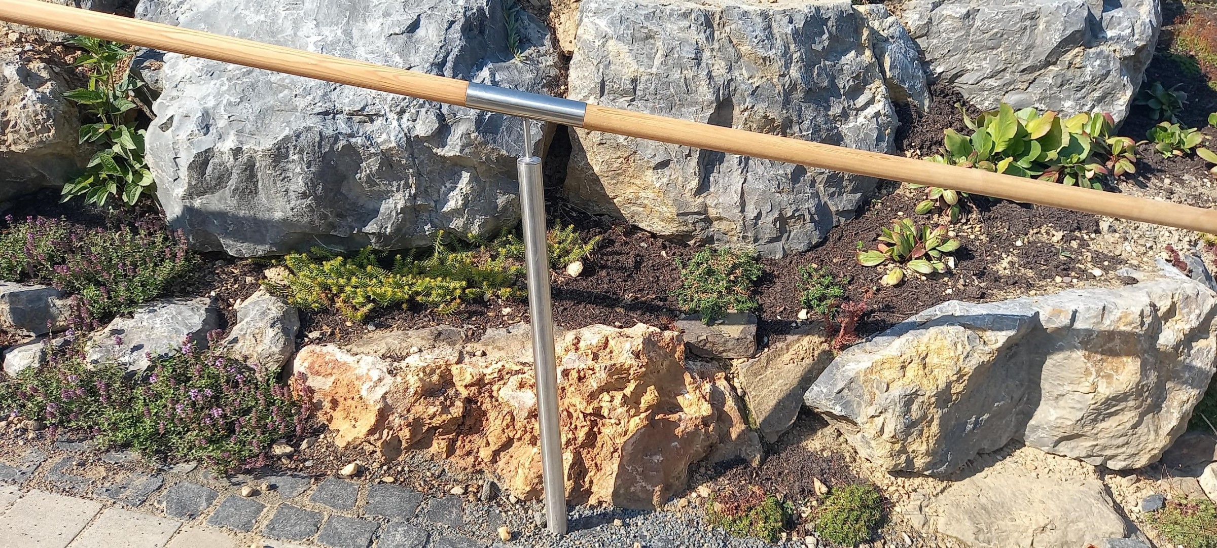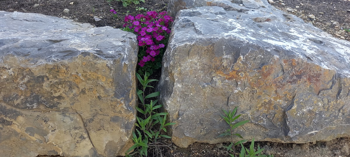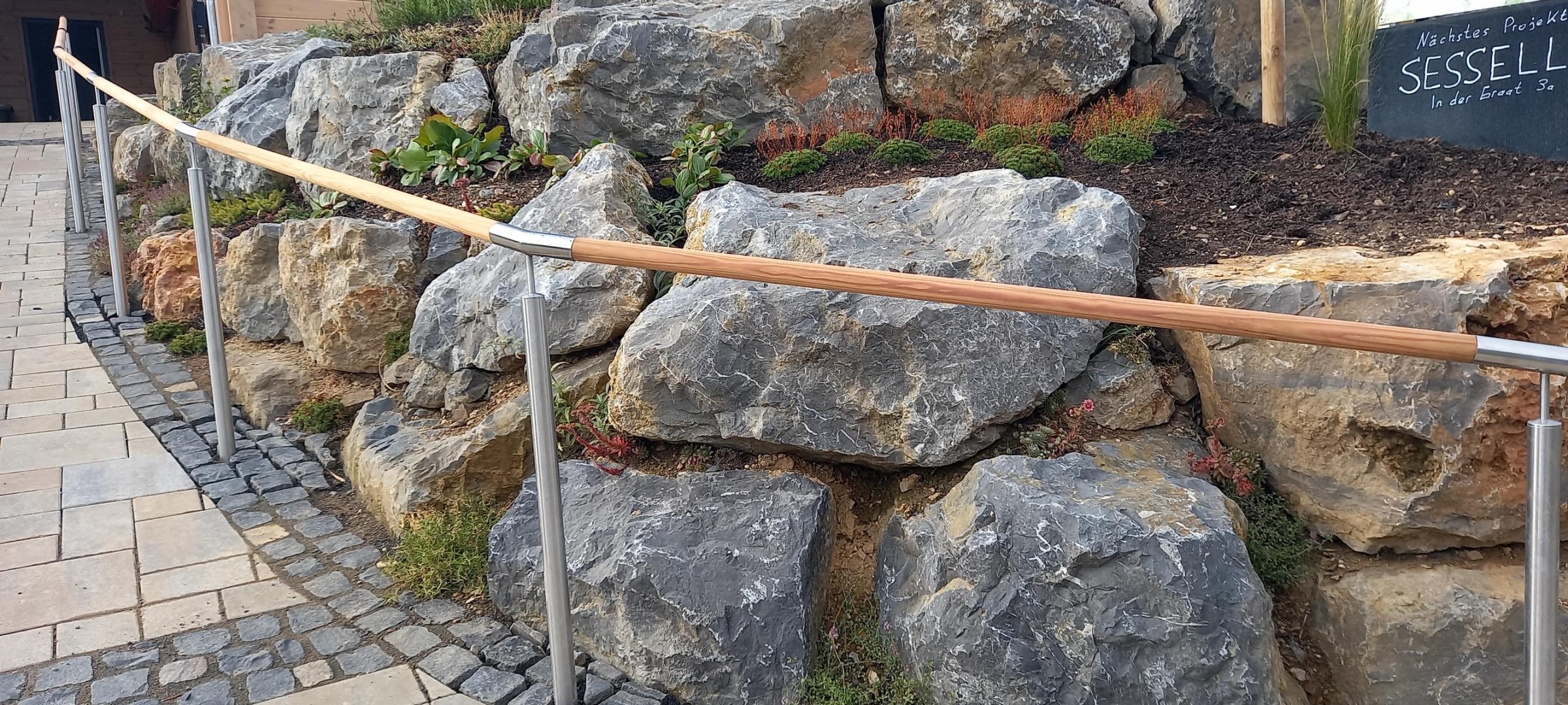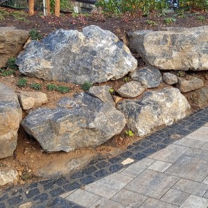 Die ca. 18 % steile Auffahrt wurde zu beiden Seiten mit bis zu 1,8 t schweren Kalkstein Findlingen begrenzt. Die Fugen zwischen den Steinen wurden mit den entsprechenden Stauden und Gräsern bepflanzt.